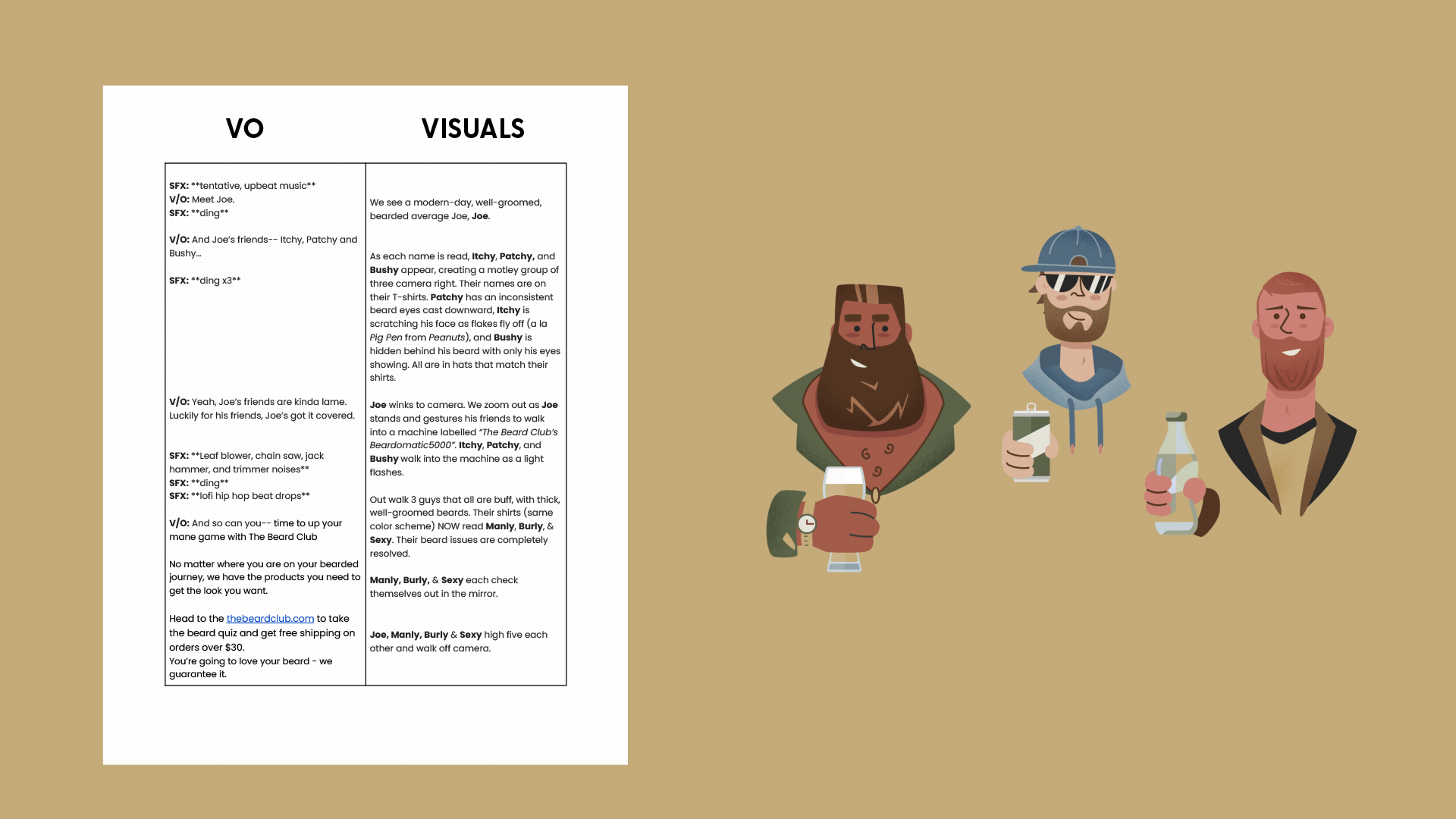 Every story needs a script. I was provided with one and some visual cues to hit along the way. The client had a clear idea of what they wanted, but they were open to suggestions on how to make that vision pop on screen. This is where visual scripts come into play. The idea is simple: the script on one side and the visuals/actions on the other.