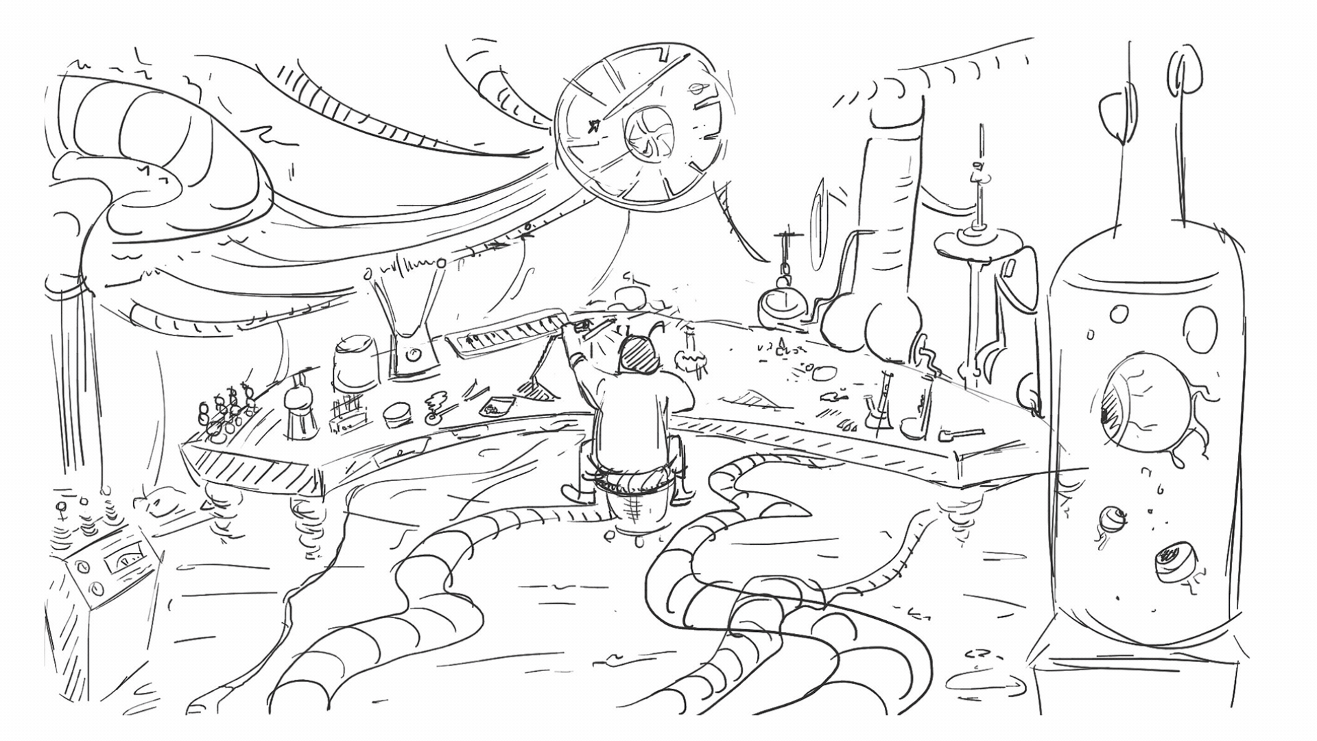 Since the video is over three minutes long, we start with a sketching phase that covers all of the lyrics and addresses all of the themes in the song. This rough storyboard gives us a bird's eye view of the visuals.